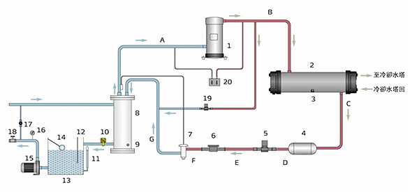 →RCM- W系列冷水机启动后,压缩机1开始运转,制冷剂在压缩机的作用下变成高温高压气体,往BC方向运行,进入冷凝器2与冷却水进行热交换后变为液态,热量被冷 却水带走;C-D-E-F过程,从冷凝器中出来的液态制冷剂经过干燥过滤器4,干燥、过滤杂质后通过液管电磁阀5、视液镜6后到达膨胀阀7,F-G过程 中,高压液体制冷剂通过热力膨胀阀节流降压后,温度降低;G-A过程中,低温低压制冷剂经过蒸发器8与冷冻水发生热交换,将冷冻水冷却至设定温度;经蒸发 后的低温气态制冷剂返回至压缩机1,如此循环,达到冷却效果。